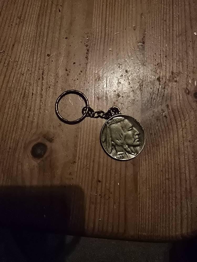 Large Buffalo Head Nickel with Indian Chief on reverse (33mm dia) Keychain, attached to a Antique Bronze Tone Key Ring with Chain Lanyard. Note: The design of this reproduction is modeled on a real Indian Head Buffalo coin (21.2mm dia.) but is larger in size (1-5/16" diameter).